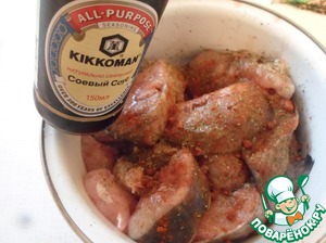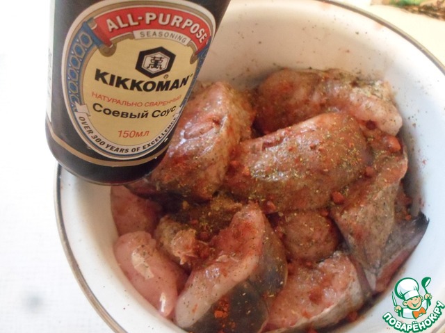 Рыбу нарезаем на кусочки, посыпаем всеми специями, вливпем соевый соус.