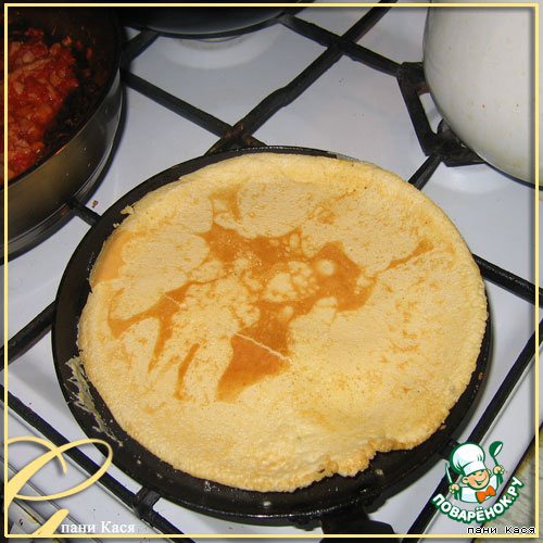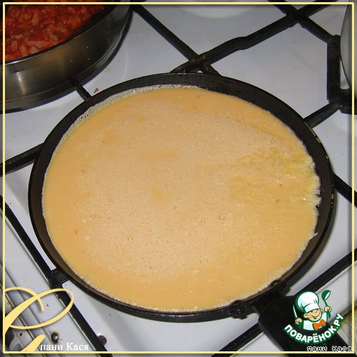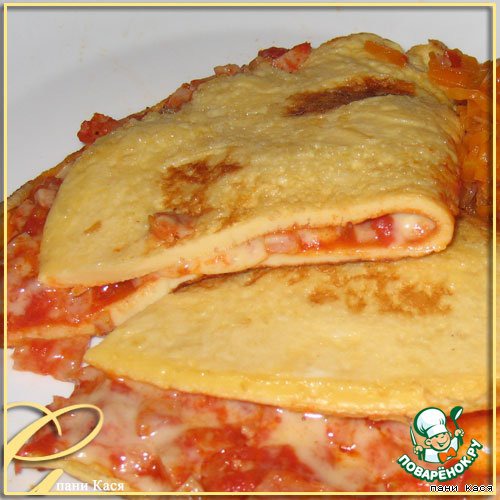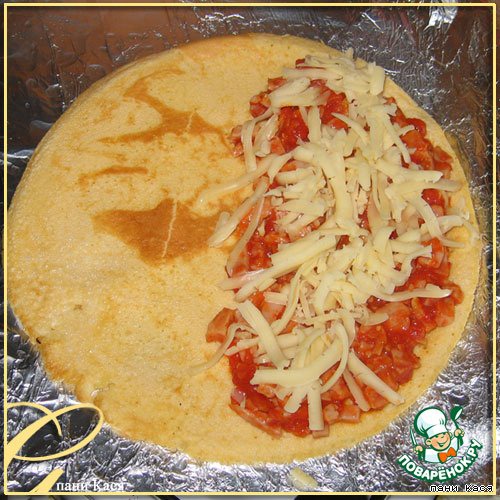 На противень раскатываем фольгу, на нее - блинчики, на 1 половинку кладем начинку и тертый сыр
