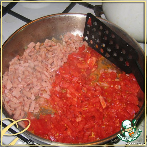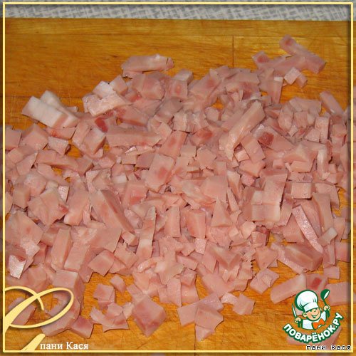 ветчину режем тонкими полосочками, кубиками - как угодно