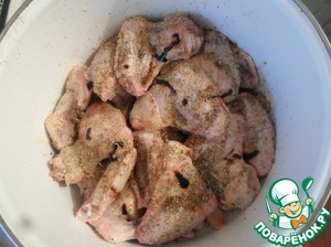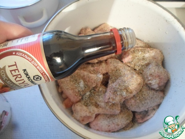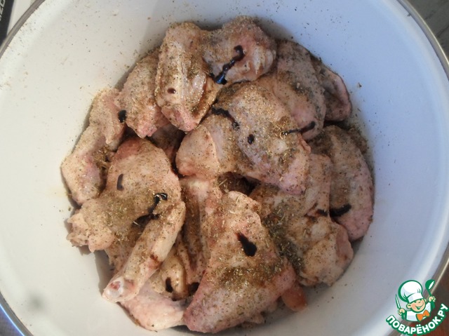 Крылышки моём, обсушиваем. Добавляем специи и соус-маринад
