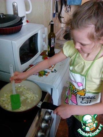 Выкладываем на сковородку с небольшим количеством масла лук, пассеруем. Ну как без помощницы)))