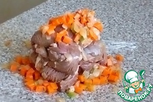 Укладываем в замечательный прибор «Маринатор» мясо и наши овощи из сковороды. Солим по вкусу. Добавляем лавровый лист. И маринуем 9 минут. Почему 9 минут - просто прибор настроен на это время. Можно и больше, мясо не испортим.