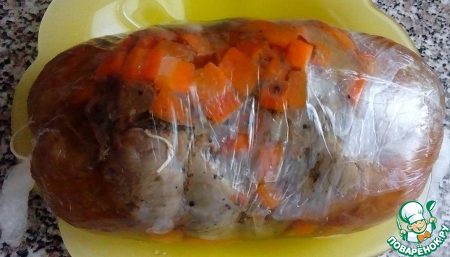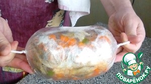 Заворачиваем в пищевую пленку вместе с овощами оставшимися в «маринаторе».