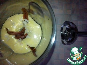В готовую основу добавляем тунца, предварительно слив жидкость. Также добавляем анчоусы и мелко нарезанный чеснок. Погружным миксером перемалываем до однородной массы. -