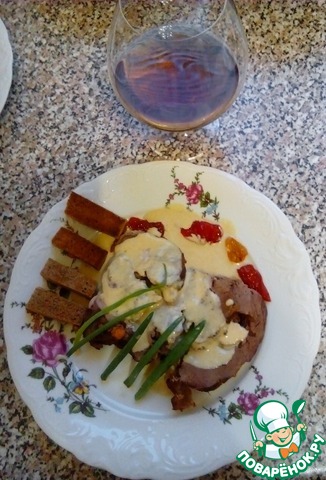 Для это блюда, как мне показалось, подойдут ржаные гренки. Куски хлеба, сбрызнув оливковым маслом, чуть-чуть посолив крупной соль, ставим в духовку минут на 8-10. Выкладываем на тарелку с мясом. И вот он - результат. Приятного аппетита.