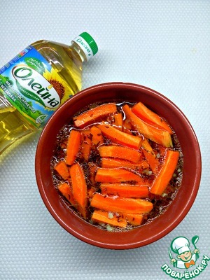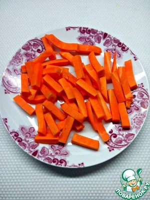 Морковь очистить, вымыть, порезать палочками. Я резала с помощью сеточки для нарезки картофеля фри.