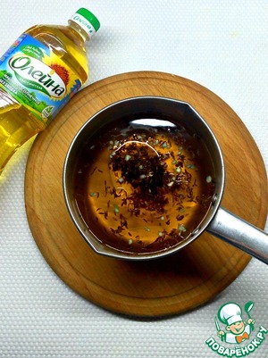 Чеснок очистить, пропустить через пресс или натереть на терке. Добавить к маринаду. Также добавить тмин и подсолнечное масло "Олейна". Довести до кипения и кипятить 2 минуты. -