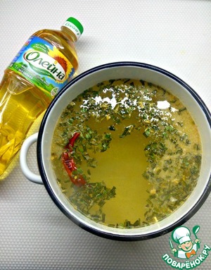• В кастрюлю налить 2 литра воды, довести до кипения. Подсолить по вкусу, добавить сушеный лук, палочку корицы и 1 перчинку чили.