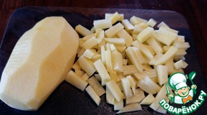 Теперь чистим и мелко режем картошку. Еще в молодости я вычитала в какой-то кулинарной книге, что нарезка овощей для супа должна быть не кубиками, а брусочками, с тех пор так и делаю. Отправляем картошку в суп.