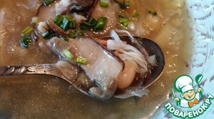 Вместо рульки отправляем в суп грибы /у меня сырые белые, уже нарезанные тонкими ломтиками и замороженные/. Предварительная разморозка в данном случае не требуется.