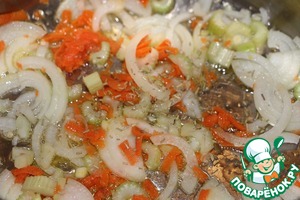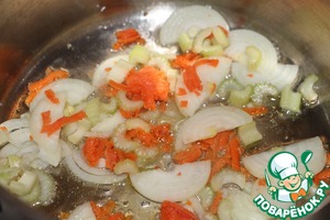 Репчатый лук порезать полукольцами, морковь потереть на крупной терке, черешковый сельдерей порезать кусочками. Разогреть в кастрюле с толстым дном растительное масло, обжарить на среднем огне лук до мягкости, не допуская зарумянивания, добавить морковь и сельдерей, готовить 5 минут.