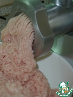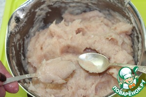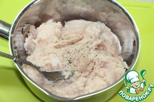 Остатки молока добавить в куриный фарш. Фарш посолить и пробить погружным блендером.