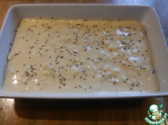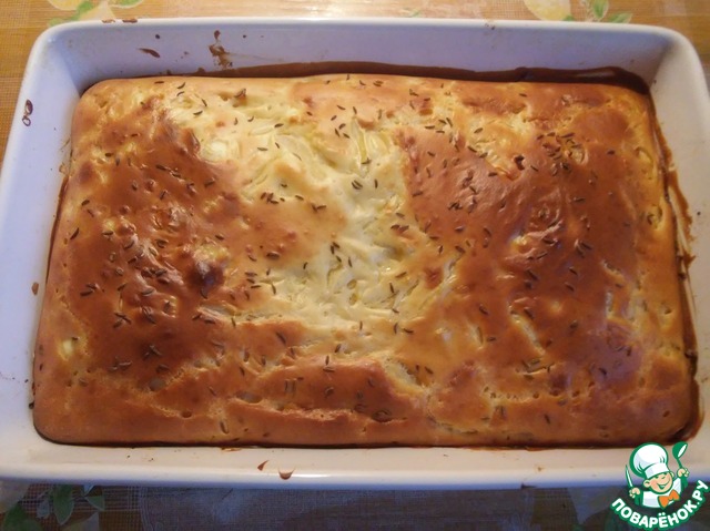 Залить начинку оставшимся тестом. Присыпать тмином.