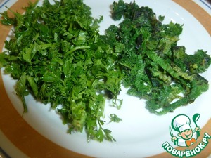 В это время нарезаем крапиву (можно её предварительно обдать кипятком) и петрушку.