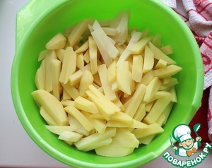 Картофель почистить и нарезать небольшими брусочками. Промыть тщательно в холодной воде, чтобы смыть крахмал, и просушить полотенцем.