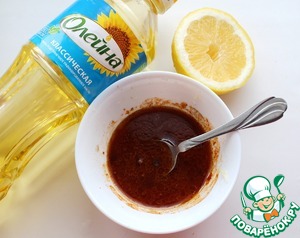 Сделать заправку. Смещать сок половины среднего лимона, масло подсолнечное, соль, перец, мускатный орех и сладкую паприку. Залить картофель и тщательно перемешать, чтобы картофель полностью был покрыт смесью.