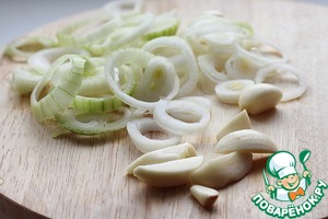 Лук и чеснок почистить. Лук нарезать тонкими кольцами. Чеснок оставить целым.