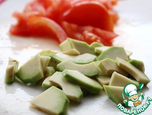 Авокадо очистить от кожуры, нарезать небольшими дольками и сбрызнуть лимонным соком, чтобы не потемнел. Помидоры нарезать полукружками.