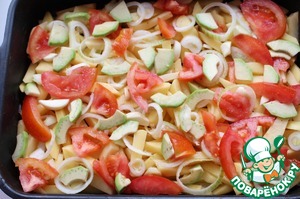 На дно большой формы выложить картофель и распределить по всей поверхности. Очень желательно выложить картофель одним слоем. Сверху положить лук, чеснок, помидор и авокадо, слегка подсолить. На счет авокадо, есть небольшой нюанс: если у Вас неспелый авокадо, кладите сейчас. Если спелый, то в самом конце готовки, иначе может горчить.