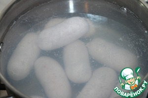 Вскипятить в кастрюле воду и опустить колбаски в кипяток, довести воду с колбасками до кипения, затем огонь убрать до минимального и варить при слабом кипении 40 минут.