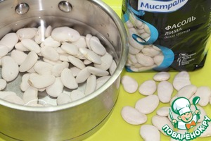 Фасоль замочить в большом количестве холодной воды на 8-10 часов. Воду периодически нужно менять, или поставить тару с замоченной фасолью в холодильник, во избежание закисания фасоли.