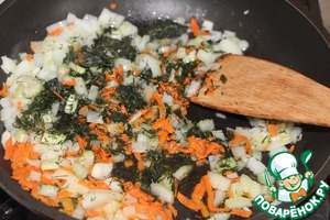 В глубокой сковороде или сотейнике с толстым дном разогреть оливковое масло, обжарить лук и морковь до мягкости, добавить сельдерей, укроп и чеснок, готовить еще 5 минут. -