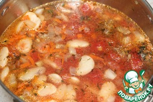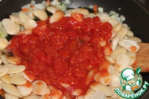 Добавить фасоль, помидоры консервированные в собственном соку и порезанные (если свежие, то без кожицы и порезанные кубиками)