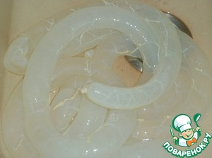 Делать их нужно заранее. И первое, что необходимо, это подготовить кишки. Они куплены в вакуумном герметично запаянном пакете, и в огромном количестве соли. -