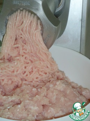Филе куриной грудки и филе куриных бедер провернуть через мясорубку с крупной сеткой диаметром 18 мм два раза.