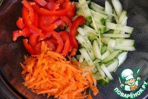 Перец и огурец нарезаем тонкими полосками, морковь натираем на терке.