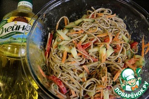 Собу отвариваем в кипящей воде 6-8 минут (согласно инструкции), откидываем на друшлаг и промываем холодной водой. Если нет собы, то можно использовать любые тонкие спагетти или другие макаронные изделия.