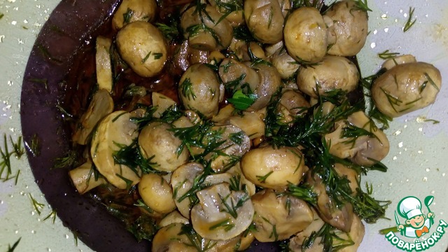 Процеживаем готовый маринад, заливаем им шампиньоны и тушим 10 минут на медленном огне.