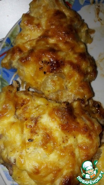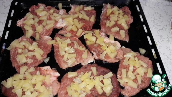 Смазываем противень подсолнечным маслом. Отбиваем мясо, солим, перчим. На отбивные кладем ананасы (если кусочки крупные, то их лучше порезать потоньше, у меня было самое то)