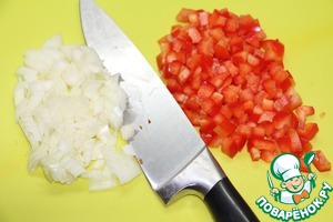 • Лук порезать кубиками. У перца удалить белые перепонки и семена. Порезать кубиками.