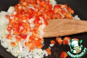 • Обжарить сначала лук 3 минуты, не допуская зарумянивания, потом перец, тушить еще 3 минуты.