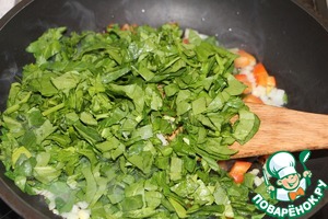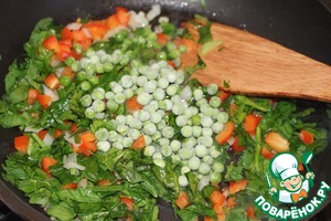 • Всыпать зеленый горошек, посолить. Тушить, пока масса шпината не уменьшится вдвое. Остудить.