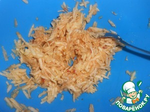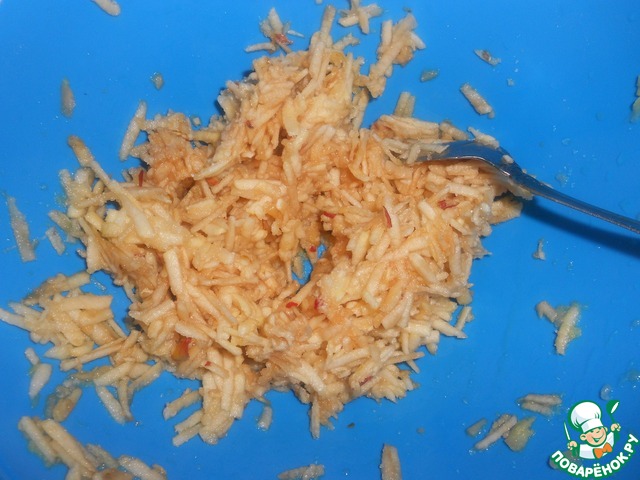 Яблоки натереть на крупной терке, добавить оставшийся сахар,2 ст. л. апельсинового сока.