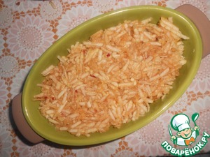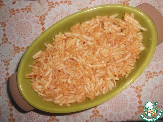Все аккуратно перемешать и выложить в огнеупорную форму, смазанную маслом.