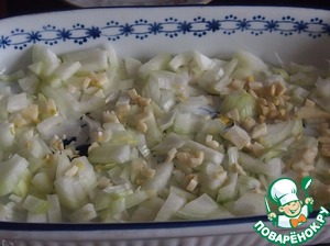 Рецепт очень простой. Крупную луковицу порезать довольно крупно, чеснок на маленькие кусочки. Сложить в посуду, в которой будете запекать мясо.