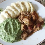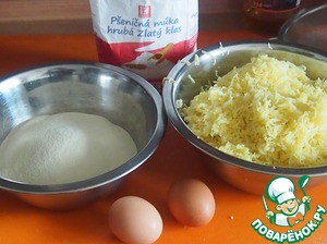 Теперь кнедлики. Если вы решитесь их готовить, то нужно заранее свалить картошку в мундире, очистить и остудить ее. Cами кнедлики преспокойно сделаете в то время, пока мясо тушится в духовке. Картошку натереть на мелкой терке. Добавить яйца, соль и муку. Если нет муки грубого помола, можно использовать и обычную, в этом случае, возможно, ее понадобится немного больше.