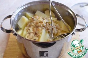 С готового картофеля слить воду, добавить луковую обжарку, помять в пюре.