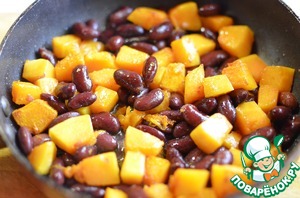 Тыкву порезать кубиками и обжарить на небольшом кол-ве растительного масла, добавить фасоль, посолить по перчить и еще немного обжарить.