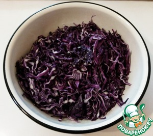 Краснокочанную капусту нашинковать, присолить, добавить сахар и перемешать. Мять не надо!