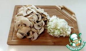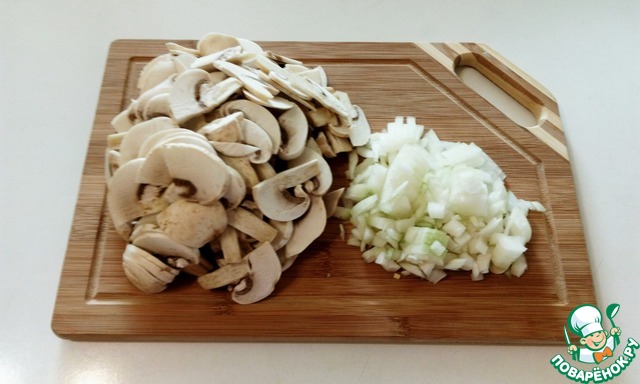 Пока готовится капуста лук нарезать кубиком, а грибы четверть пластинками.