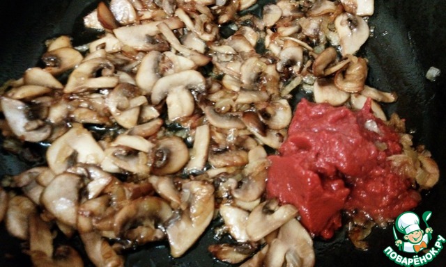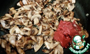 На подсолнечном масле обжарить грибы с луком до румяности, и добавить томатную пасту и немного воды. Тушить пару минут.