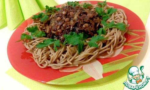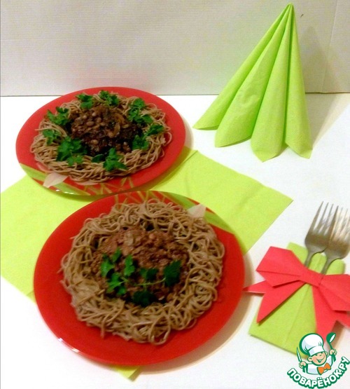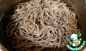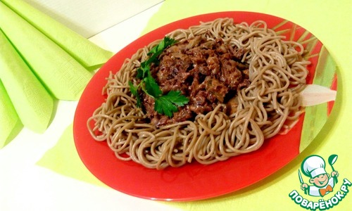На гарнир хорошо подходит гречневая лапша или гречка. Я подавала с лапшой, отварив ее по инструкции и заправила подсолнечным маслом.