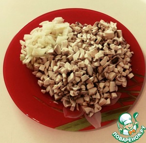 Пока горох варится делаем для него заправку. Лук и грибы нарезать мелко кубиком.