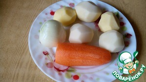 Пока закипает вода, готовим продукты. Картофель, морковь и лук чистим и моем.