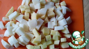 Картофель режем средними кубиками и бросаем в кипящую воду.