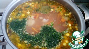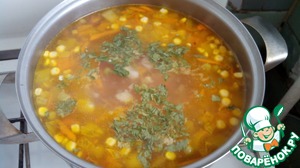 Добавляем свежую зелень, доводим до кипения и выключаем. Суп готов.